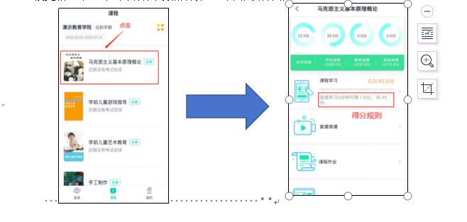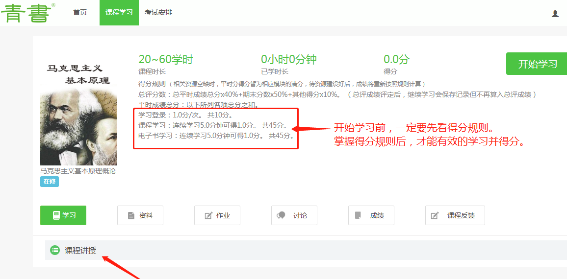 点击进入某个的课程,然后看到“课程学习”,首先看到“课程学习”下面有两行灰色小字体,是得分的规则。