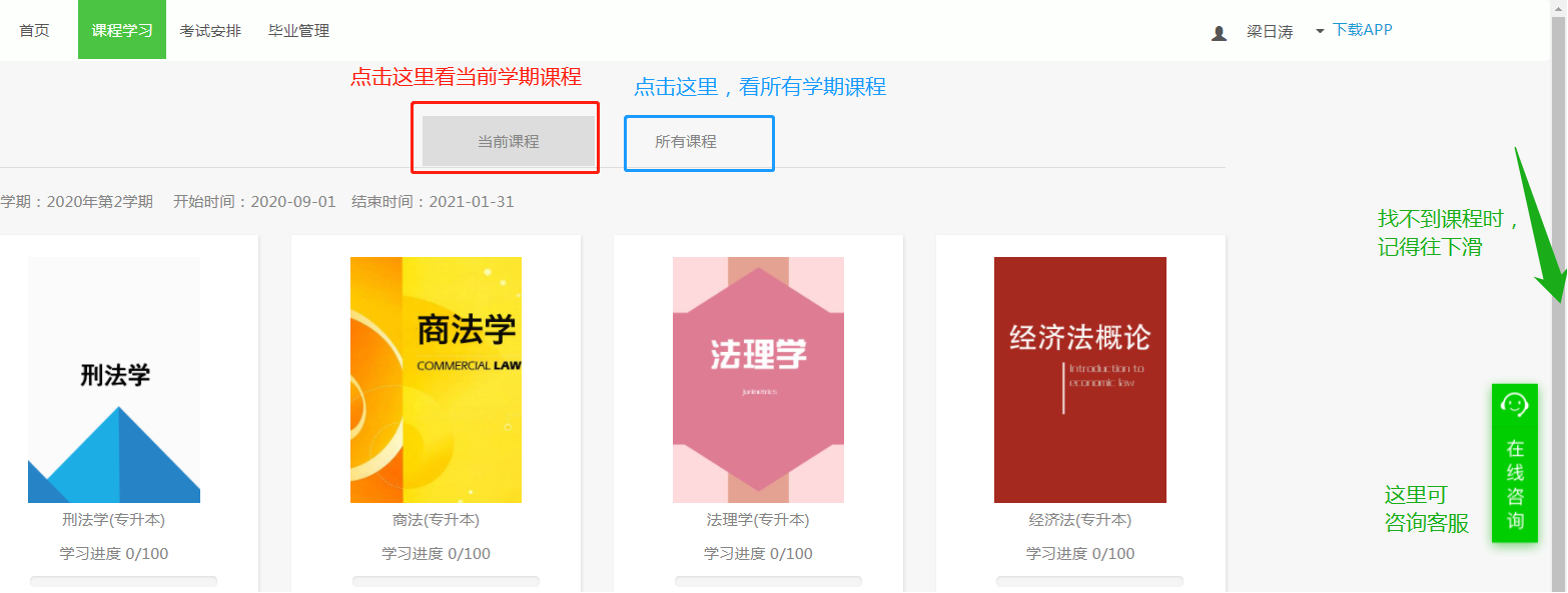 学生登录后在“首页”就能看到当前学期的课程,如首页里没有内容,点击“课程学习”,“所有课程”,即可看到课程。